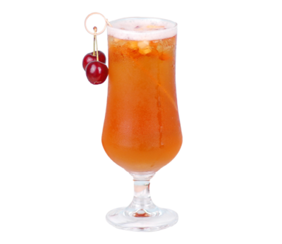 蜜桃公主 蜜桃红茶 配料: 「新的」蜜桃红茶 50ml 朗姆酒 20ml 椰子酒 10ml 纯净水 200ml 冰块 100g 制作步骤: 1.把朗姆酒、椰子酒、冰块放入雪克壶,摇均匀装杯。 2.把柠檬红茶和纯净水混合,倒入杯中。 3.桃粒和车厘子装饰。