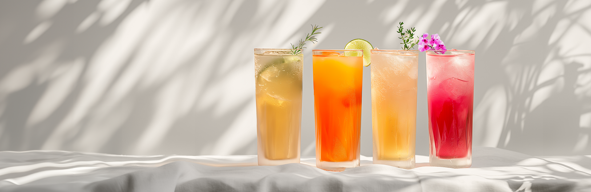 Get Inspired by Our Recipes Scroll down 21 Feb 2019 Even more ways to enjoy Sunquick! Did you know Sunquick isn’t just a great social mixer but also a versatile base for creating delicious drinks, baked goods, meals, and desserts? Sharing the joy means discovering new flavors, so explore our collection of exciting recipes and get inspired! Flavours All AppleBerry MixBlackcurrantLemonMangoMixed MangoOrangeOrange & PeachPineappleTropical Flamingo Golden Beach Mango Tango Mango & Jasmine Tea A Mojito Girl Mango & Coconut Sorbet Enchanting Lemongrass Blackcurrant Soda Kiss of Blackcurrant Hot as Ice Blackcurrant Ice Tea Redberry Snowball There are no matches for the selected categories Flamingo 20ml Sunquick Tropical 90ml Cranberry juice 10ml Fresh Lemon juice 90ml Sparkling water How to: Pour Sunquick Pineapple, cranberry juice and fresh lemon juice in the shaker and shake well Strain it and pour it in a chilled champagne tulip Also pour the sparkling water in it Put the straw and garnish with green lemon slice. Enjoy! Golden Beach 40g Sunquick Mango 10g Sunquick Lemon 10g Fruit sugar 120g Ice cubes 180ml Soda water How to: Add Sunquick Mango, Sunquick Lemon and fruit sugar in a glass Add ice cubes in it Slowly pour soda water in it and mix well before serving! Mango Tango 30ml Sunquick Mango 10ml Yuzu Tea 2 Teaspoon Aloe Vera jelly 1 Jasmine Teabag 250ml Warm water (200ml hot water+50ml cold water) How to: Dip jasmine teabag in hot water and remove it after a minute Add rest of the ingredients, stir well and enjoy! Mango & Jasmine Tea 25ml Sunquick Mango 15ml Fruit sugar 200ml Jasmine Tea 200ml Hot water How to: Add all the ingredients in a glass and stir well Garnish it with fresh mango cubes and slices. Enjoy! A Mojito Girl 10ml Sunquick Mango 40ml Purified water 40ml Soft drink 20ml Green Lemon juice 2 springs of mint leaf How to: Use the muddler to crush green lemon to extract the juice. Add mint leaves in it and crush them together Pour it in a glass which is filled with crushed ice Add a small amount of soft drink Pour Sunquick Mango in it and wait for it to diffuse in the drink Add rest of the soft drink Garnish it with mango slice and mint leaves. Your drink is ready to be served! Mango & Coconut Sorbet 20ml Sunquick Mango 1/2 Banana 1/2 Orange 150ml Ice cubes 2 Teaspoon Coconut powder How to: Blend all the ingredients in a blender Pour it in a glass, put a straw, garnish it with a mango slice and serve chilled! Enchanting Lemongrass 30ml Sunquick Orange 5ml Sugar syrup 300ml Lemongrass water How to: Pour the Sunquick Orange and sugar syrup in a glass Slowly add lemongrass water in it (the temperature should be around 80-85°C) Garnish it with orange peel and cinnamom stick. Enjoy! Blackcurrant Soda 20ml Sunquick Blackcurrant 200ml Carbonated drink/ Sparkling water How to: Pour the Sunquick Blackcurrant in a glass filled with ice Fill the glass with sprite, put a straw in it and garnish it with fresh strawberry and green lemon peel. Your drink is ready! Kiss of Blackcurrant 20ml Sunquick Blackcurrant 250ml Coca-cola 1 Teaspoon Fresh Lemon juice How to: Pour all the ingredients in the glass with ice cubes and stir well Put the straw in the glass, garnish it with lemon slice and some mint leaves. Its ready to be served! Hot as Ice 20ml Sunquick Blackcurrant 20ml Orange juice 10ml Green Lemon juice 80ml Purified water 1 Red pepper How to: Blend all the ingredients till it turns into smoothie Pour a little bit of Sunquick Blackcurrant into the martini glass, then pour the smoothie in the glass Garnish it with the red pepper and enjoy the drink! Blackcurrant Ice Tea 20ml Sunquick Blackcurrant 200ml Black Tea 1 Teaspoon Sugar How to: Add white sugar in black tea, mix it and let it cool down Add Sunquick Blackcurrant in the black tea Stir it well, put the straw, garnish it with green lemon slice and some lemon balm leaf. Its ready to be served! Redberry Snowball 20ml Sunquick Berry Mix 150ml Ginger ale 6 Strawberries 2 scoops of vanilla ice cream How to: Pour Sunquick Berry Mix at the bottom of the glass Add 2 scoops of vanilla ice cream Fill the glass with ginger ale and garnish it with berry sprig. Drink is ready! Load more